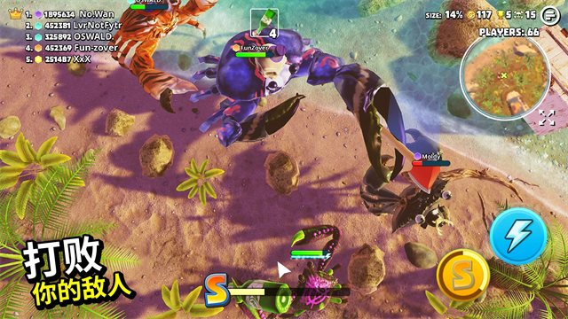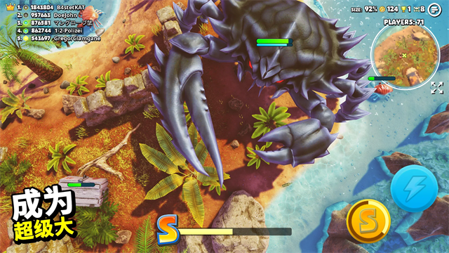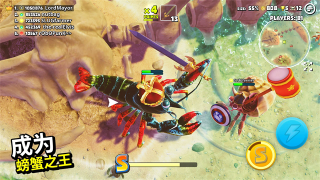2、趣味的战斗,控制你的螃蟹和其他的玩家们进行激烈的对战,去寻找强大的武器,享受这个战斗的乐趣