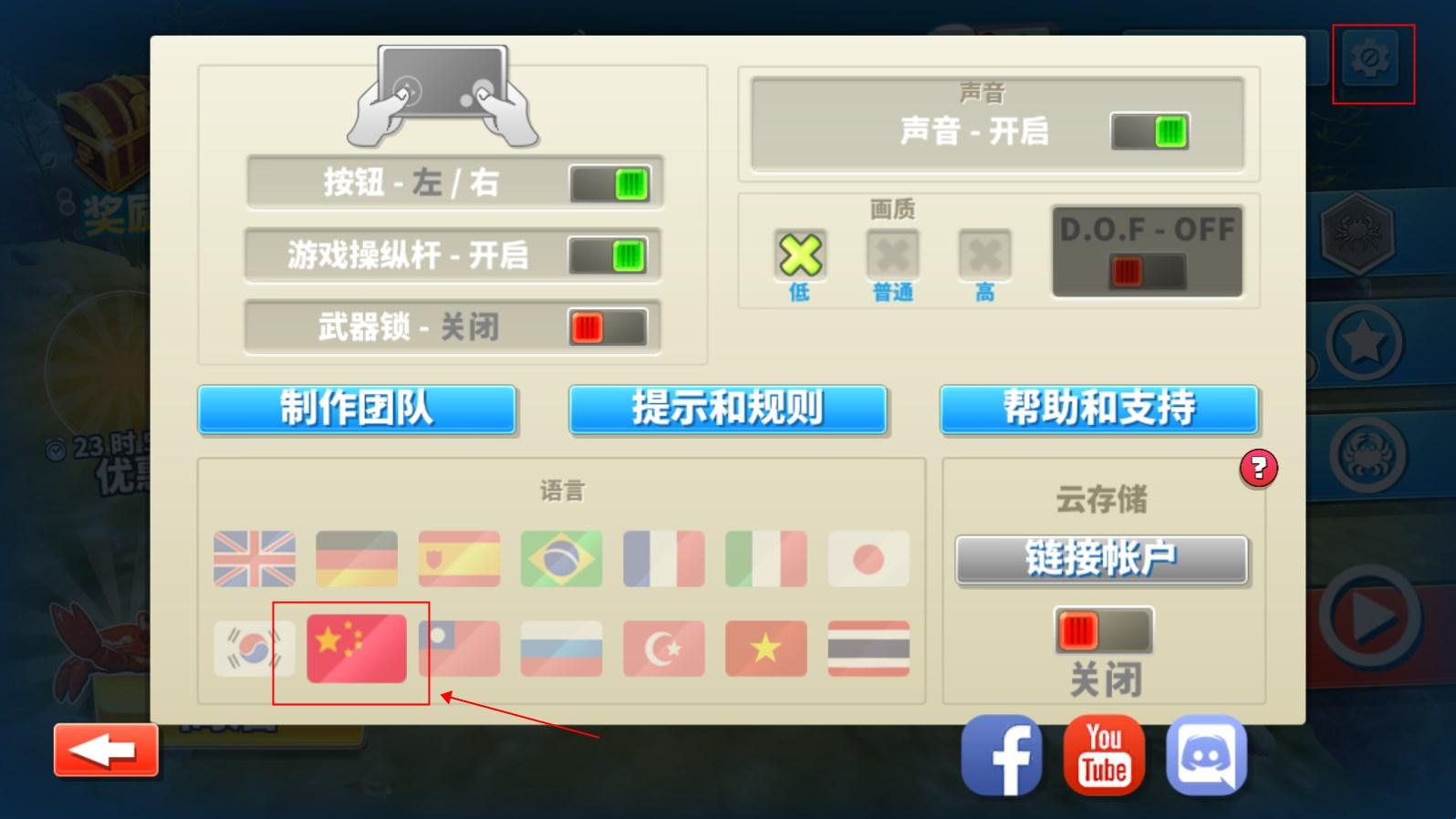 1、在本站下载好螃蟹之王以后,点击右上角的设置按钮,选择五星红旗即可设置为中文语音。