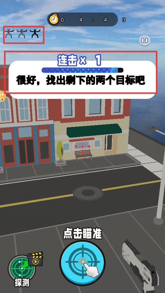 4、完成射击后,依据【连击x1】和剩余【2】个目标提示,继续搜寻并消灭其余目标。