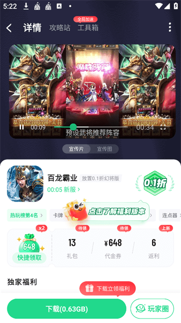 2、找到心仪的游戏后,可直接在平台内了解游戏详情、查看开服时间,点击下载安装并开始游戏,享受平台提供的折扣和福利。