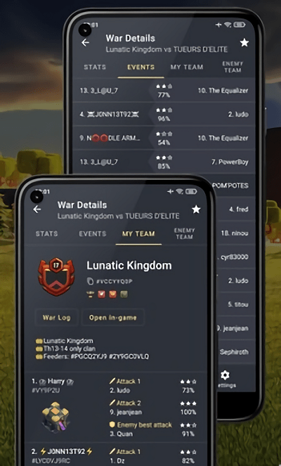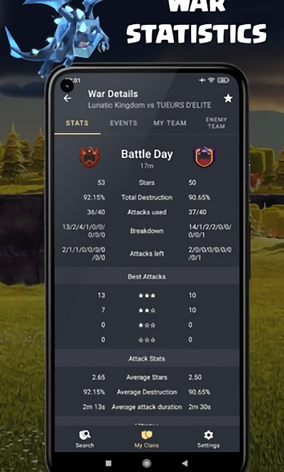 1、游戏中每个氏族战争的实时数据。剩余时间,攻击和防御,统计和更多;