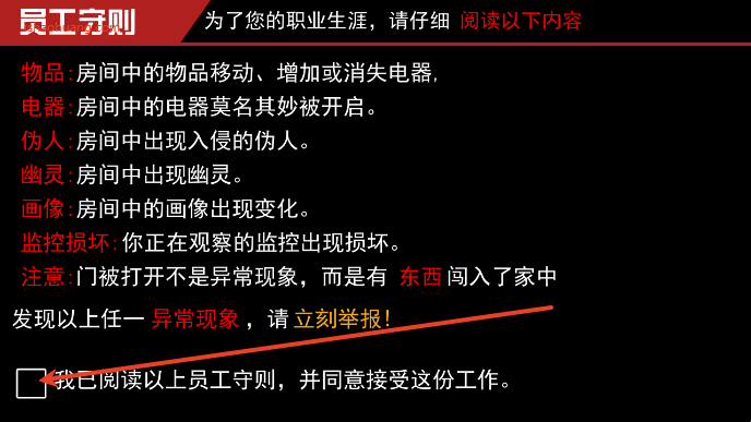 3、以时间推进为任务线,从开始到次日六点,随着时间推移可能出现更多异常,营造逐步升级的紧张感,考验玩家持续专注力。