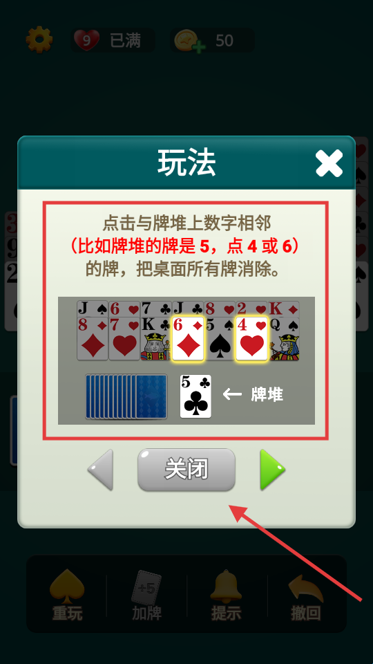 1、玩法规则为点击与牌堆数字相邻(±1)的牌,如牌堆【5】点【4】或【6】,需消除桌面所有牌。