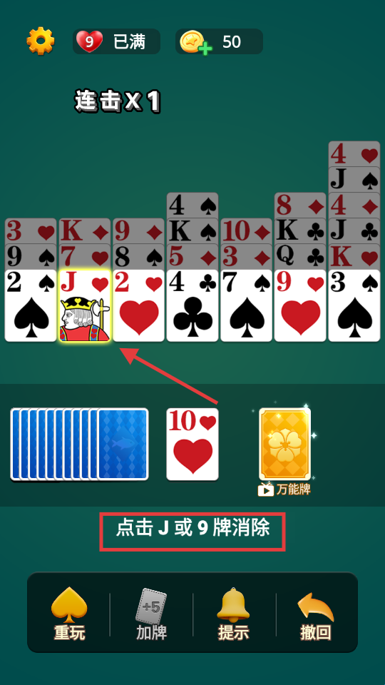 2、牌堆为【10】,J比10大1,点击桌面上的【J】牌,触发连击消除,遵循相邻规则。