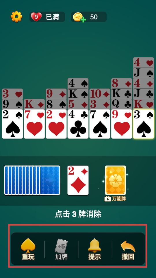 3、牌堆为【2】,3比2大1,点击桌面上的【3】牌消除,下方功能按钮可辅助操作。