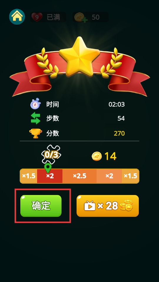4、通关后点击绿色【确定】按钮,结算时间、步数、分数等奖励,进入后续流程。