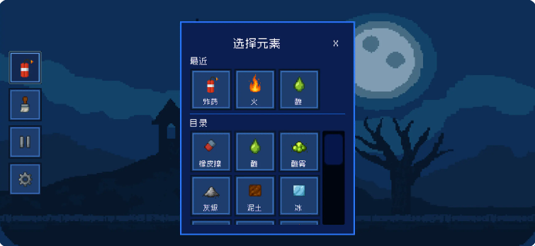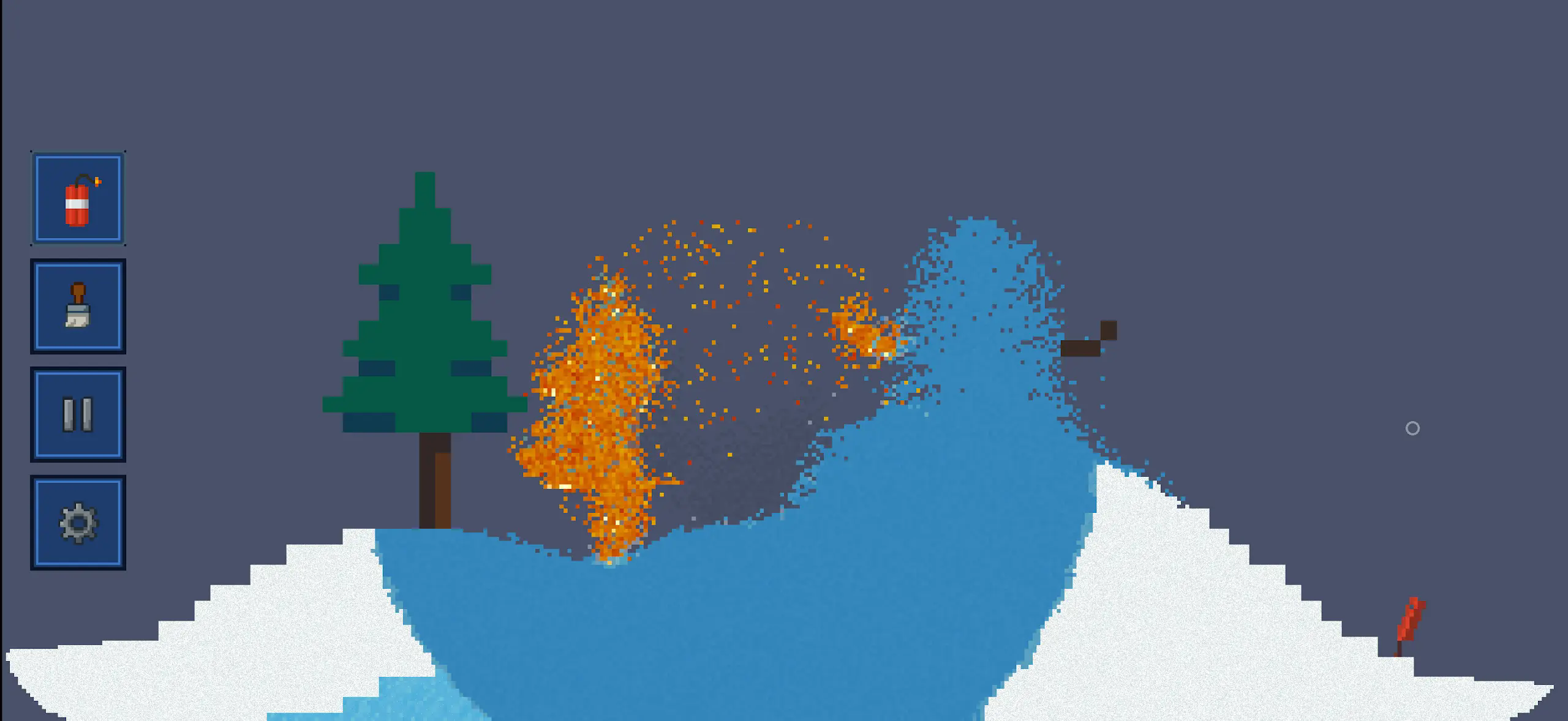 1、元素模拟器:数十种材料,液体流动,火焰蔓延,连锁反应。