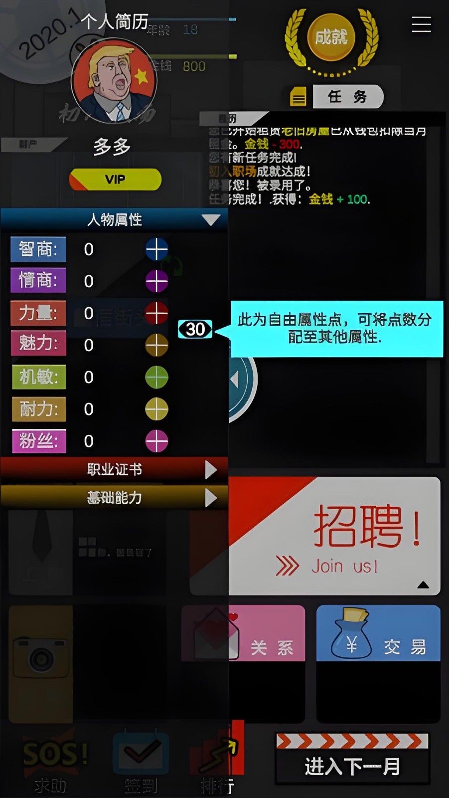 4、需要玩家注意的一点就是,该游戏角色属性对于打工赚钱的影响深远,点击进行角色属性界面,可以自由分配属性点,如智商、情商、力量、魅力、机敏、耐力和粉丝。