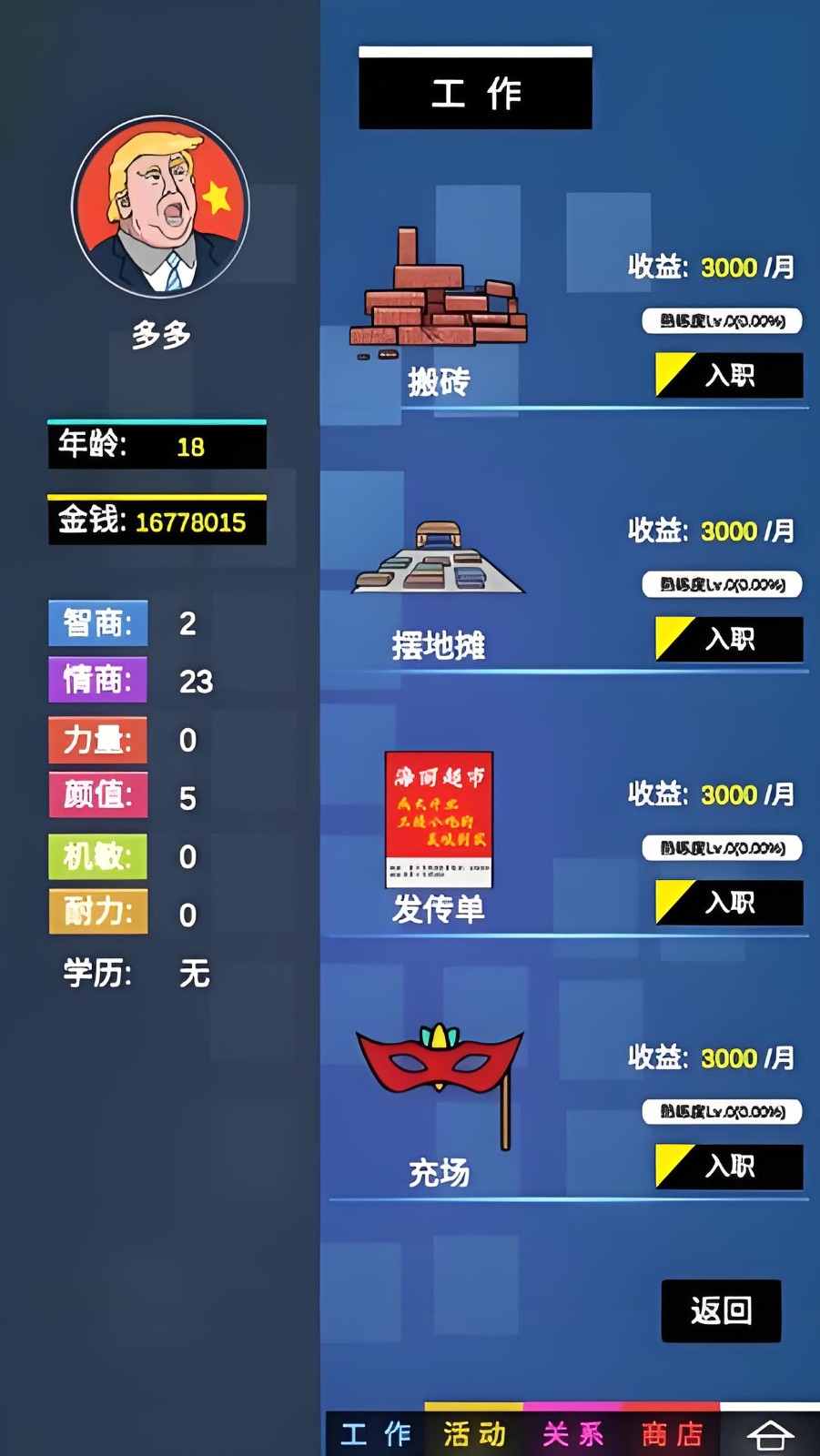 其他的玩法还有很多,比如提升学历,工作详情,活动信息,以及在工作中的社会关系。与此同时,玩家可以自由掌控时间,待你完成全部的当前项目,便可提前进行下一月。