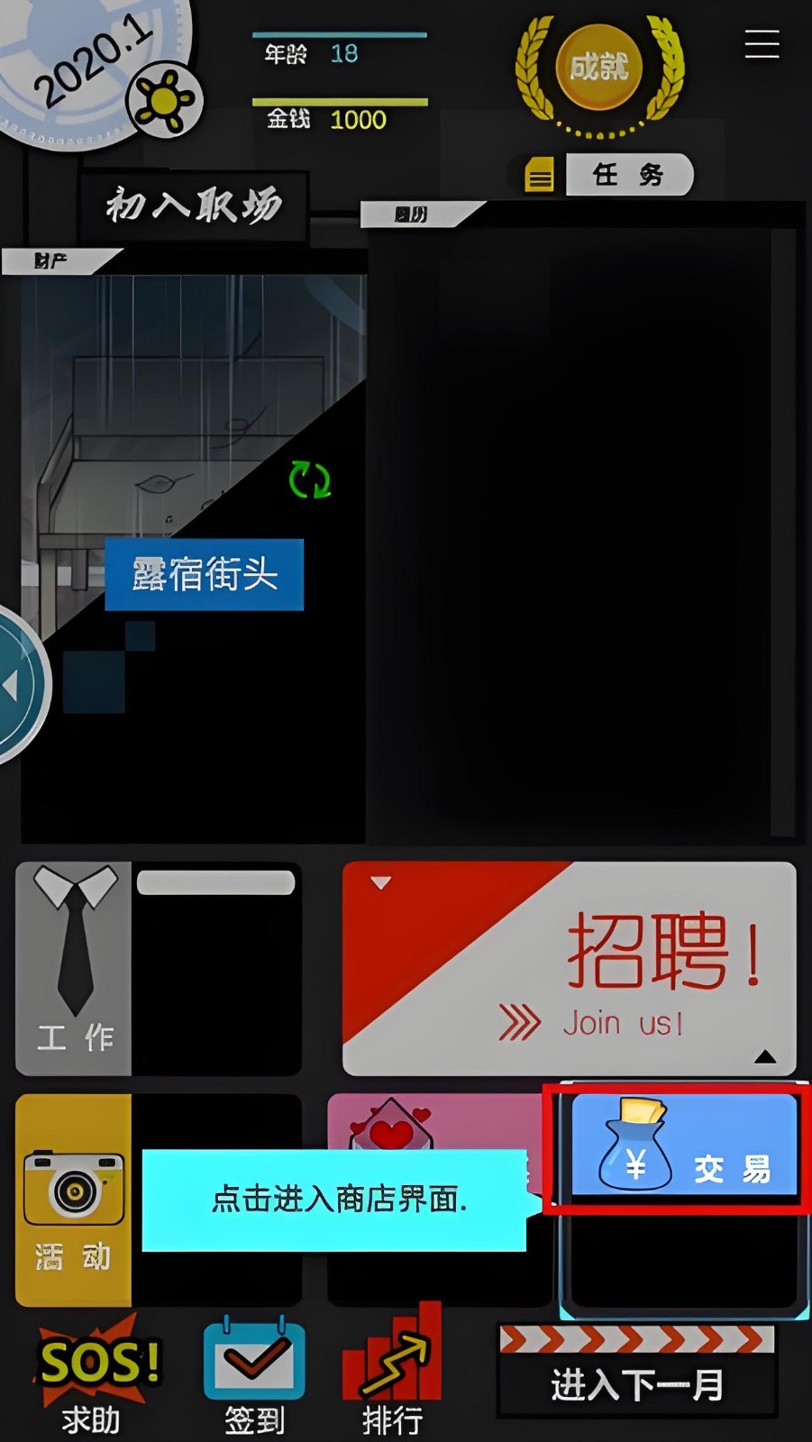 2、一切设定好之后,便要开始模拟你的职业生涯啦,刚到陌生的城市,先找个落脚点,点击“交易”进入商店界面,然后在“房产”的众多选择中,租赁一套便宜的房子开始在这座城市的打拼。