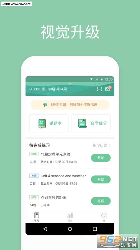 及时查收老师推荐练习的通知,英语、数学在线做,手机完成,随时随地,快速方便;
