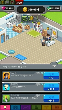 在游戏中玩家可以装饰你的公司,招募更多的员工为你工作,并时刻关注股票动态,以低价买进,高价出售,从中赚取利益,欢迎试玩!