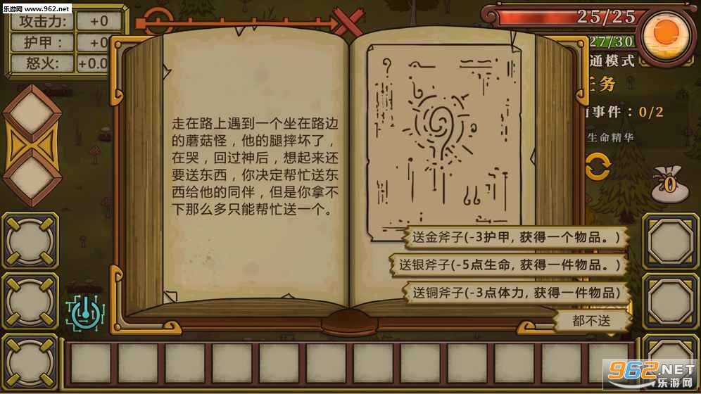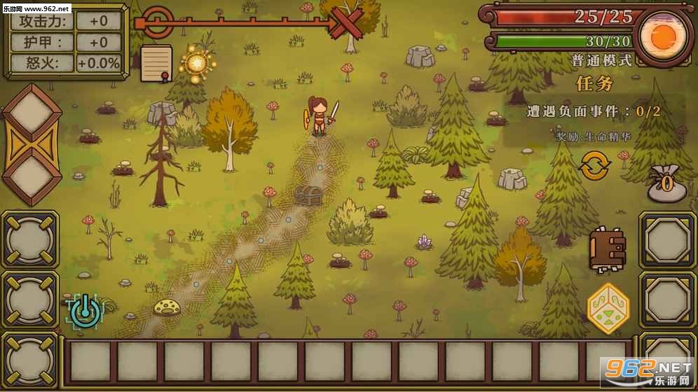 游戏总共有四层地图,每层都存在祭坛、商店、小怪、宝箱等(这不废话吗?),但最重要的是当任务走到空地时会触发特殊事件,也就是说基本每一步都会有事件触发,人物角色自带一个天赋技能,以及3个宝石槽和3个装备槽。