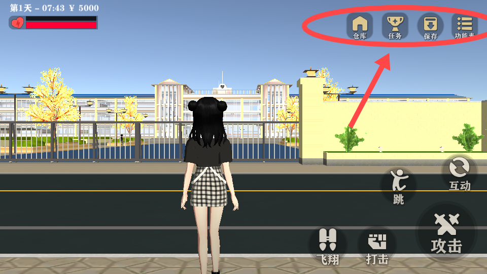 2、进入游戏场景后,熟悉界面上方【仓库】【任务】【保存】【功能表】等功能按钮,利用右下角【互动】【攻击】等操作键进行游戏活动。