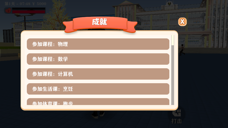 3、留意【成就】系统,完成如【参加课程:物理】【参加课程:数学】等任务,逐步推进游戏进程并获取相应成就。