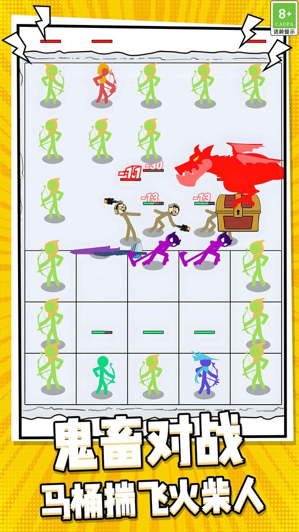 将置身于充满魔性的火柴人战场。排兵布阵,指挥火柴人抵御红色恶龙、紫色刺客等敌人的进攻。快来开启这场魔性又刺激的对战之旅!