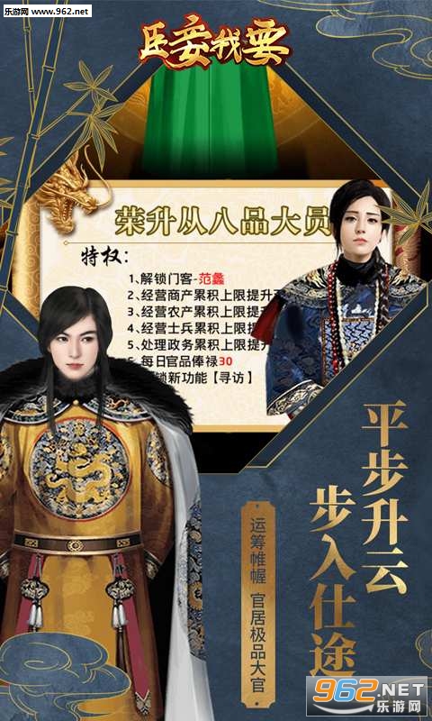 《臣妾我要》是一款以官斗养成玩法为主的RPG手机游戏,中国风的宫廷场景,多途径可快速升迁,江山美人尽在掌中,还能结婚生子,强强联姻,打造最强官场势力,招兵买马,富可敌国!从小官开局到一手遮天,烧脑官斗,震撼开启!中栩栩如生宫廷的画风,真实领略官爷日常。视听玩全方位让您亲身感受一把刻骨铭心的古风生活。告别无趣的刷怪升级,来一场明争暗斗的官场争斗!健全的官职升迁系统,体验青云直上的快感!红颜环绕养成系统,既爱江山也爱美人。你,还能坐怀不乱吗?