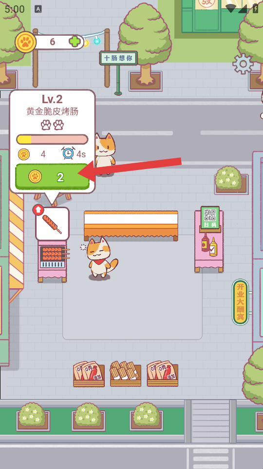 2、点击烤肠摊位后,查看弹出的信息,点击红箭头指向的绿色按钮花费金币进行升级【烤肠】。