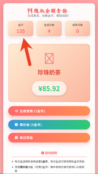 2、点击“生成”按钮,花费一定金币(如10金币)随机获得一道美食,并显示其虚拟价格(1-100元)。