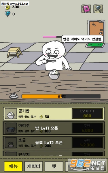 点击屏幕的小游戏,漫画风格,多个人物角色,开始你只能使用初始角色,然后你可以不断地吃米饭,通过点击屏幕可以加快吃饭的速度,然后你可以通过观看广告视频来自动吃饭,吃饭可以获得金币哦!