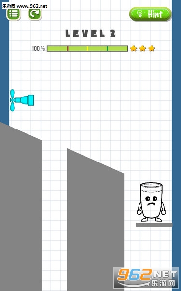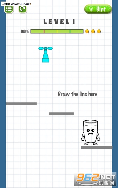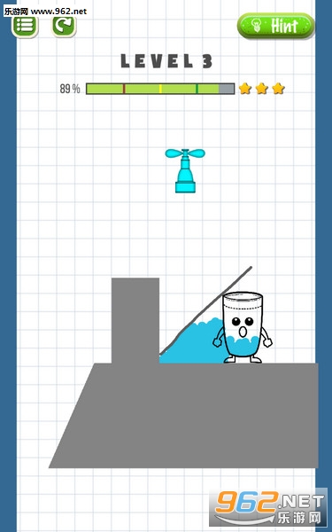 游戏画面中有一个空杯子与一个水龙头,水龙头会放出水出来,玩家需要画一条线条,让水龙头的水可以自然流入空杯子中,根据流入空杯子的水量,来得出玩家赢得获得关卡星数,有机会获得一颗星,甚至三颗星。