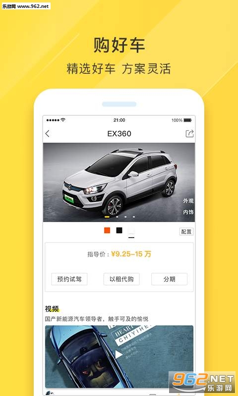 选车:按品牌、价格、车型等搜索想要的新能源汽车。在线对比车辆详细配置参数,在线与客服实时聊天咨询购车详情等。