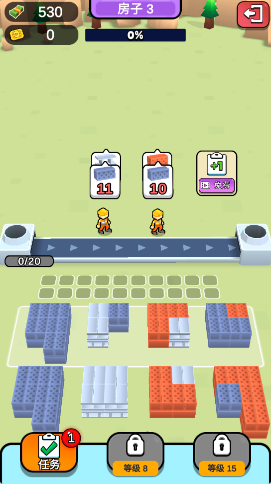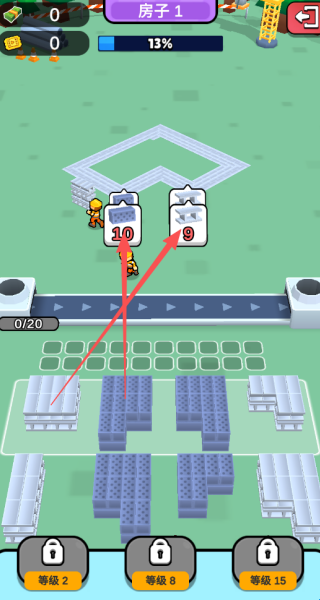 2、随着角色移动,堆叠的积木会逐步形成基本形状,当形状达标后自动转化为房屋,开启下一阶段的建造任务。
