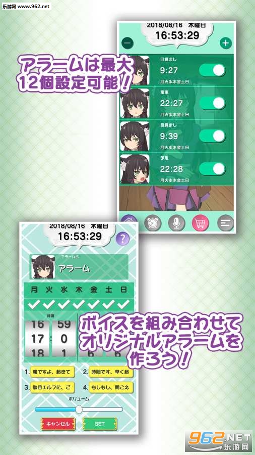 这是一款人物养成的游戏闹钟,此应用最多可设置12个闹钟。