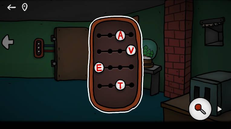 4、拿到操作杆后来到楼上墙面上有一串字母【EATV】记住字母旁边的顺序,拾取桌子底下的铲子