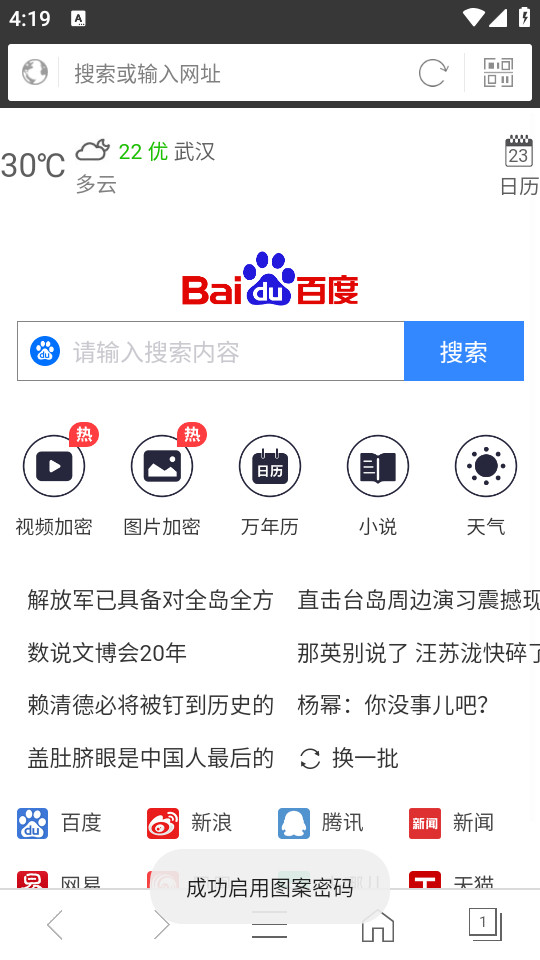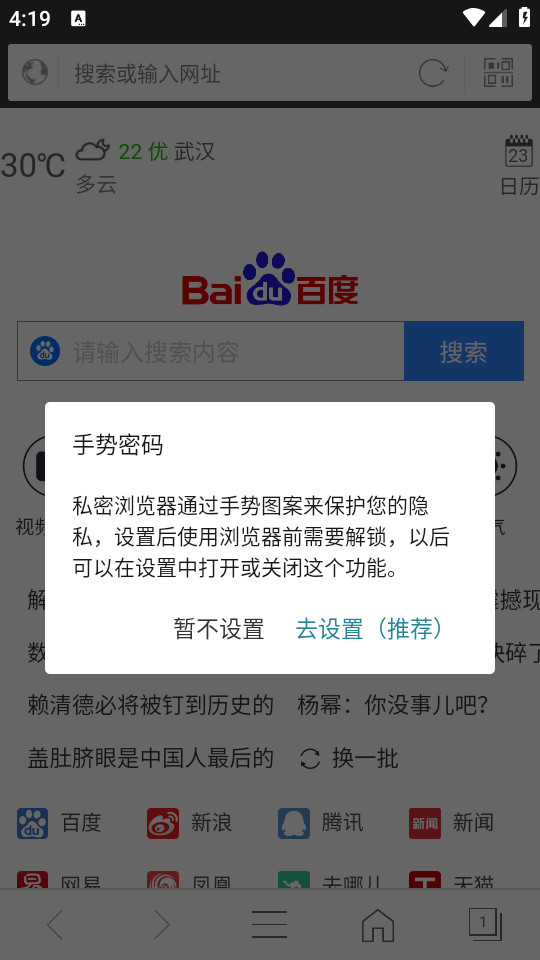 1.下载并打开私密浏览器app,跟随着教程设置好密码,进入首页之后点击页面中间的三个横线