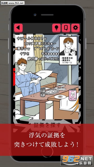 《外遇男决不容许安卓版》是一款剧情非常精彩的推理解谜类休闲手游,采用日系漫画画风,拥有丰富的关卡,玩家在闯关的过程中能够体会到精彩的剧情。游戏中你的任务就是仔细观察来寻找出轨的证据,感兴趣的玩家就快来下载试玩吧!