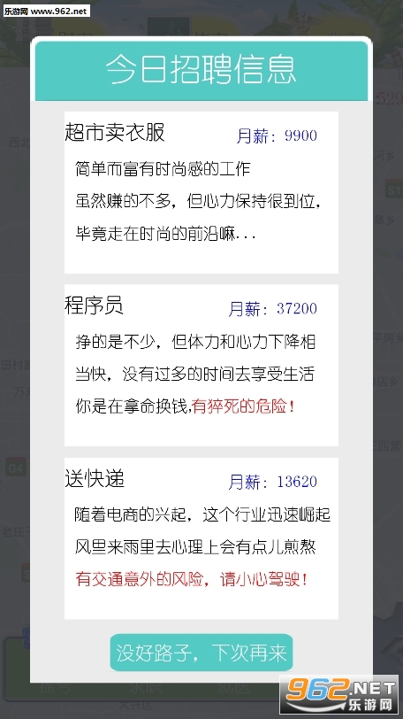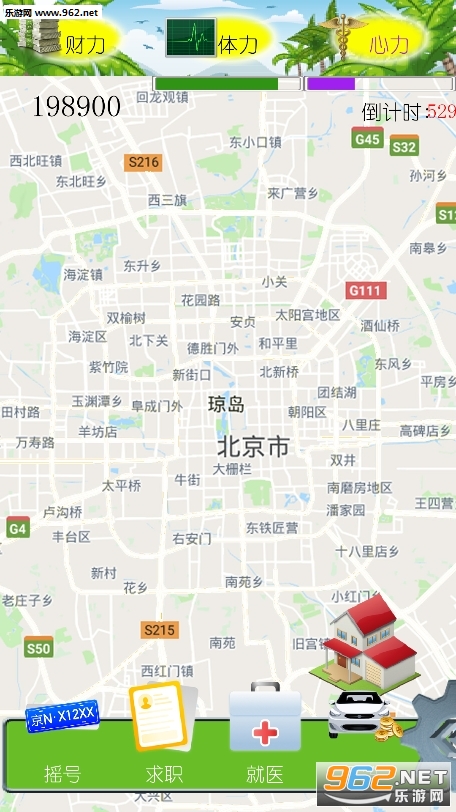 在游戏开始后地图中会不断闪现出各种道具,同时道具又分为陷阱和增长体力心力装备,点击即可增加。每天都会消耗体力,心力和钱。随着职业的不同,消耗的心力和体力不同,收入也不同。