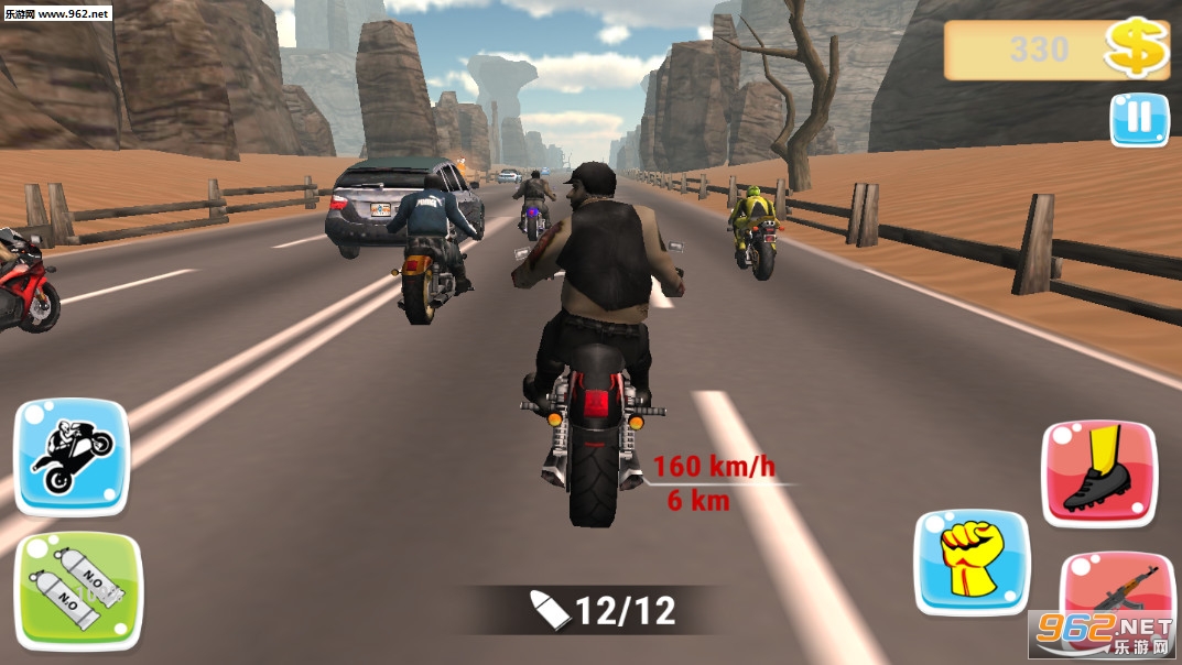 《不法骑手攻击:愤怒之路赛车战争安卓版》(Outlaw Biker Attack: Fury Road Racing Wars)是一款摩托车竞速战斗游戏,游戏中玩家可以选择不同的摩托车冒险,本款游戏不是纯竞速游戏,你还可以利用拳脚攻击其他的摩托车手,还可以使用枪械进行扫射,当然如果你撞上了障碍物或者被其他人攻击到了游戏就结束了。