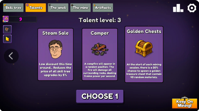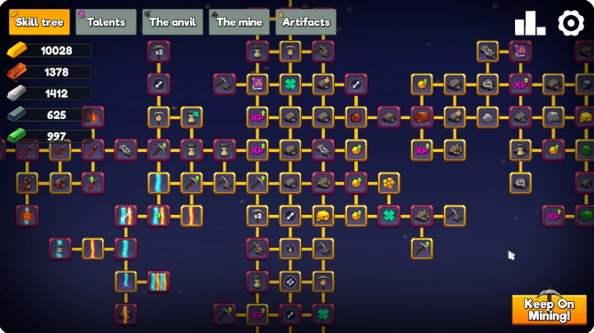 继续采矿!是一款简单的增量游戏。将光标悬停在岩石上即可自动开采。采矿区域内的任何岩石都会生成镐来为您采矿!收集材料!开采的岩石会掉落矿石,矿石可以制作成锭。有各种不同的材料岩石可供开采!技能树!消耗材料锭来解锁技能树中的升级。这些升级会永久提升您的属性,让您以更强大的力量开采岩石!制作镐!使用不同的材料制作新的镐。每把新的镐都有更好的属性,帮助您更快地开采并更有力地开采!天赋卡!每次升级,您都会获得一个天赋点。消耗天赋点来显示3张随机天赋卡——选择一张保留!选择一张卡会提高天赋等级,同时也会增加岩石的生命值。矿井!!解锁矿井后,它将自动开采岩石并立即为您制作锭。矿井是“继续采矿”的闲置机制!