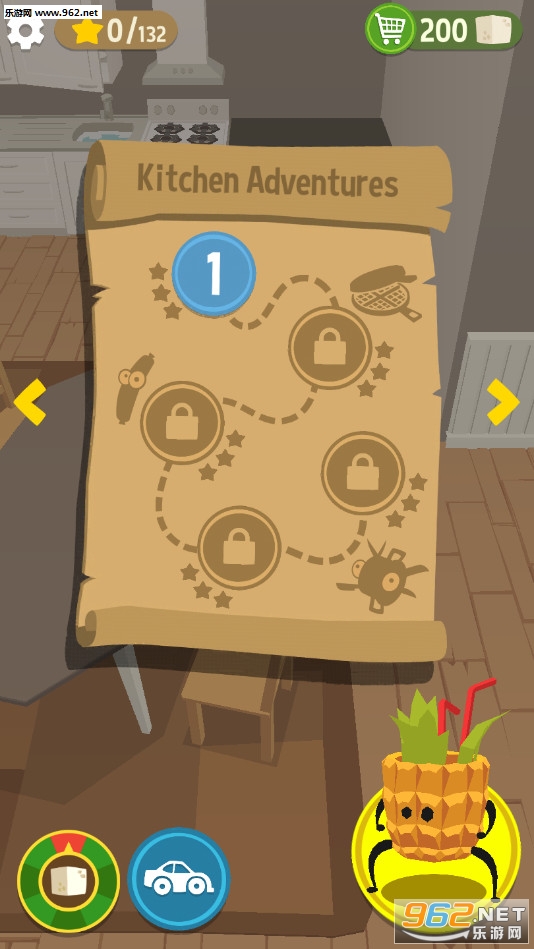 游戏是3d的 玩起来也自由很多游戏的内容就是菠萝 去找它的水果 途中有白色方块可以捡(买角色用)还有目标达成 让你去撞罐子 达成目标就有星 来解锁下一个地图 玩的时候切记不要掉下去 不然就挂了 游戏里还会有些陷阱 如锤子 会滚动的刀
