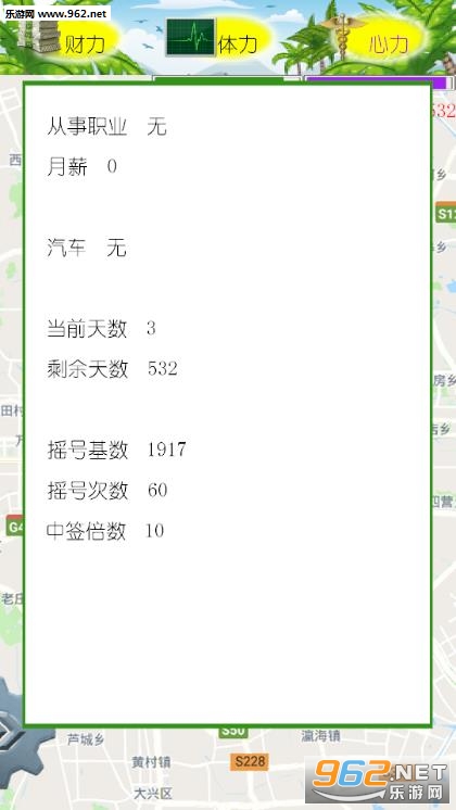 《我摇不上号游戏安卓版》是一款很有趣的文字模拟游戏,游戏中玩家扮演一名生活在帝都的人,你将会体验在北京的生活,你在这里的唯一目的就是摇上号,在规定的日期摇上号你就赢了,否则就是失败,在不摇号的时间你就需要工作生活,你可以选择你感兴趣的职业,每个职业所需要耗费的体力,心力等都是不一样的,加油吧,祝你摇上号。