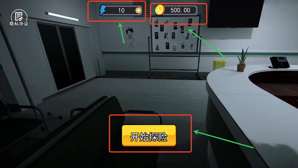 2、点击开始探险,上方分别是体能和金币数量