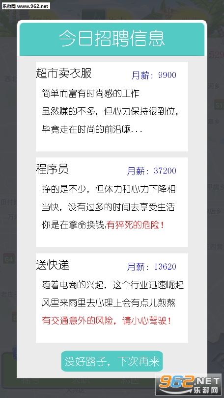 emmmmm,非常贴近现实生活的题材,脑洞清奇的游戏。玩法简单上手容易,不过到处都是坑,小编当了个程序猿之后就直接猝死了...没关系,死了还能重新再来,相信一定会摇上号的!