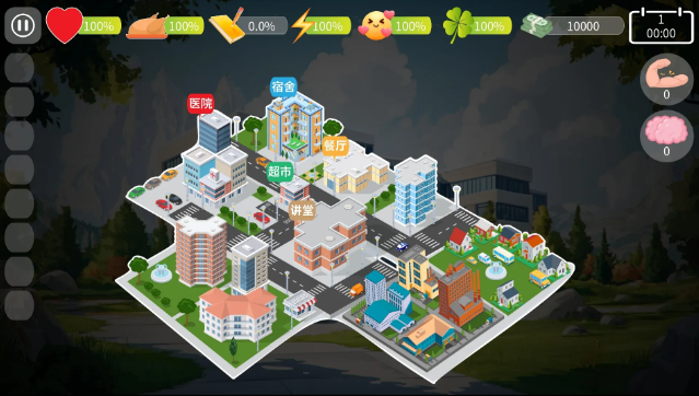 1、大学界面,游戏完全设计模仿了大学界面,可以查看所有的教学楼分布。