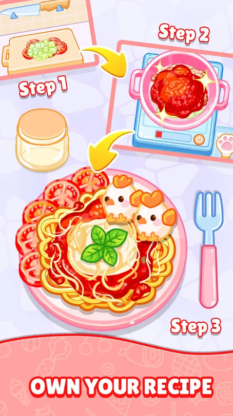 2、采用精美的手绘视觉效果和动感十足的动画,呈现出唯美治愈的氛围,让你制作的每一道菜肴都充满乐趣;