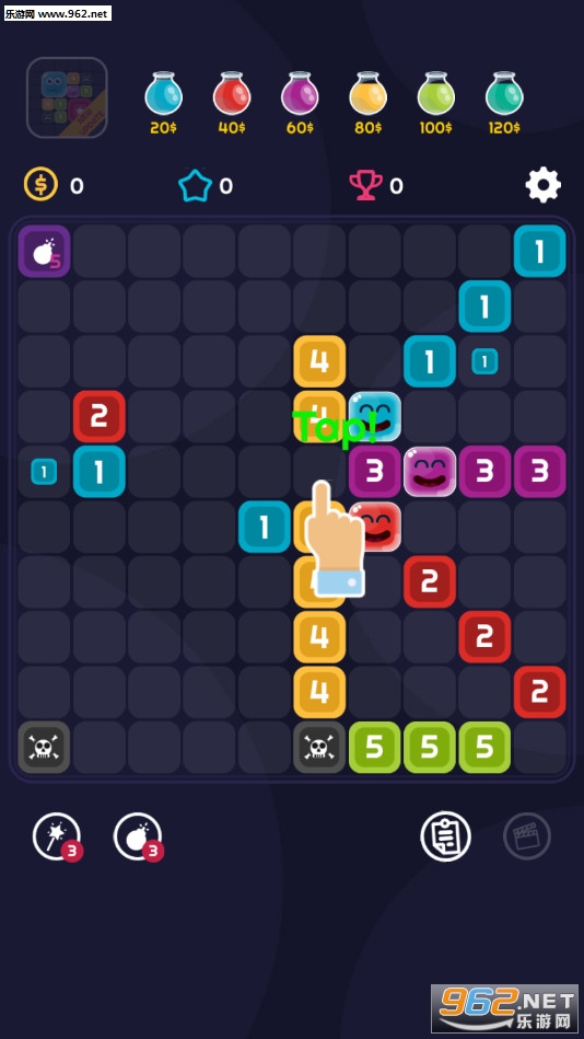非常不错的益智游戏,游戏比较考验玩家的智慧也需要点运气,数字是可以移动的,前提是移动的路线上没有其他数字和障碍物挡着,当五个以上连在一起后就可以得到一个大一的数字,有着炸弹等道具可以使用,喜欢的朋友可以下载试试。