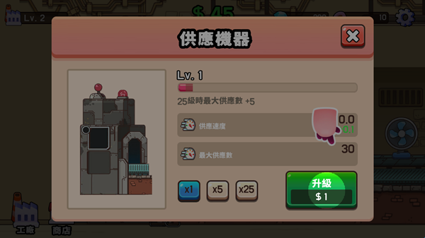 5、玩家还可以升级供应机器,提高供应速度以及最大供应数以获得更多的钞票。