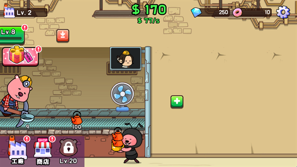 3、玩家可以在游戏过程中不断的升级自己的工厂,每次升级不仅可以提高金钱的获得量,同时还可以增加锤子的力量。