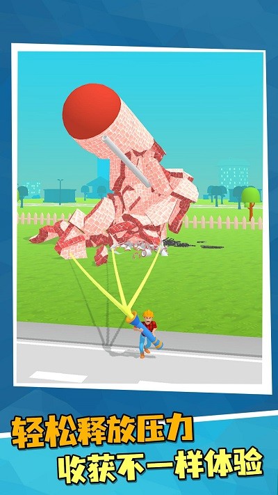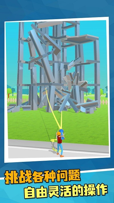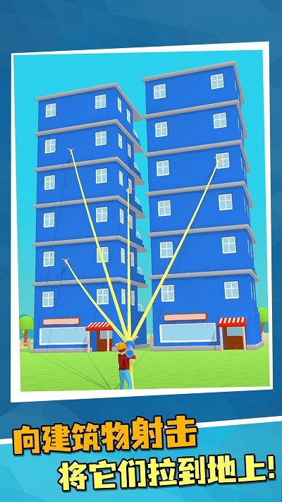 一款非常轻松又休闲的趣味性闯关类游戏,游戏画风好看又精美,操作简单易上手,每一次玩的时长都不会太长,玩家一定要把握住机会与时间,玩家只需要轻松用指尖滑动屏幕就能发射绳索拉倒建筑物了,破坏屏幕上所有的建筑物就能够通关哦,喜欢的小伙伴可以来试一试。