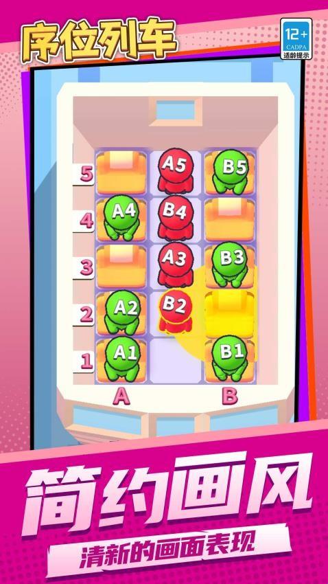 1、序位列车界面如图所示,可以在游戏显示绿色的乘客,显示红色的乘客,需要优先安排红色愤怒的乘客到座位