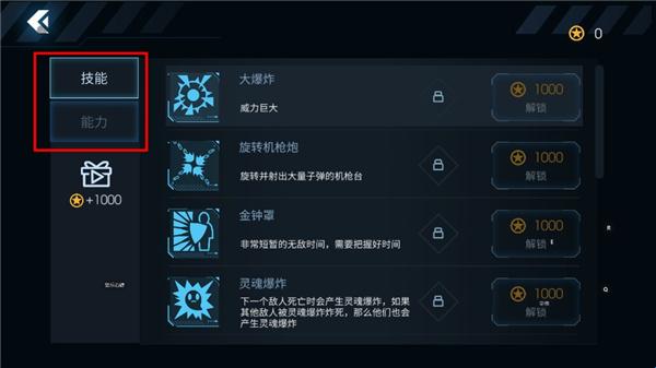 2.这里分别由游戏的技能和能力,玩家都是可以通过金币解锁的;