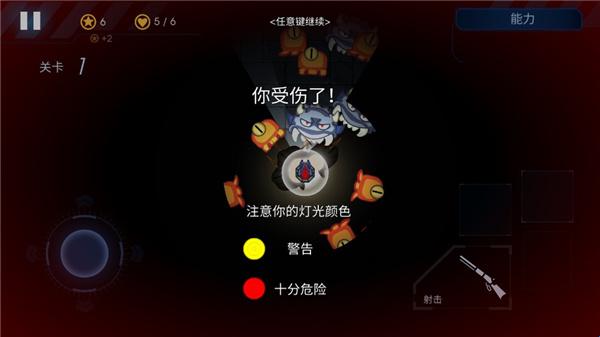 7.当怪兽出现的时候注意到及时的进行射击,注意灯光的颜色,黄色是警告,红色是十分危险;