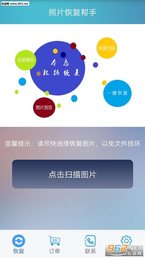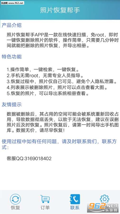 照片恢复帮手:快速扫描已删除的照片并恢复导出相册,使用过程中免ROOT,即时一键恢复删除的照片!操作简单,只需几分钟时间就能把删除的照片恢复到相册。支持恢复手机相册误删的照片、误删的照片、QQ误删的照片,其他类型图片。