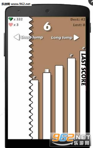 版游戏中操作看似简单易玩,实则非常考验玩家反应敏捷性能力的休闲闯关类游戏。在这里,玩家事先要根据阶梯的距离,判断好是选择长跳跃还是短跳跃,一旦选择就得重头开始。考验你的动作够不够快速,够不够敏捷,你需要不停的挑战自己,不断跳跃来越过危险境地。