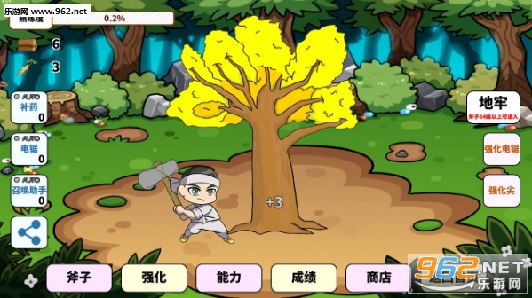 2、按到的树木可以给樵夫提升各种能力,并且还可以让场景的树木升级。